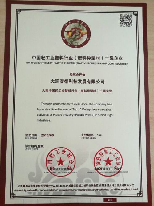 实德科技公司获中国轻工业(塑料异型材)十强企业